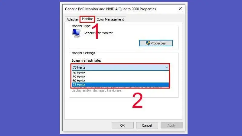 Bước 4: Vào tab Monitor và chọn tần số 75Hz hoặc Recommended.