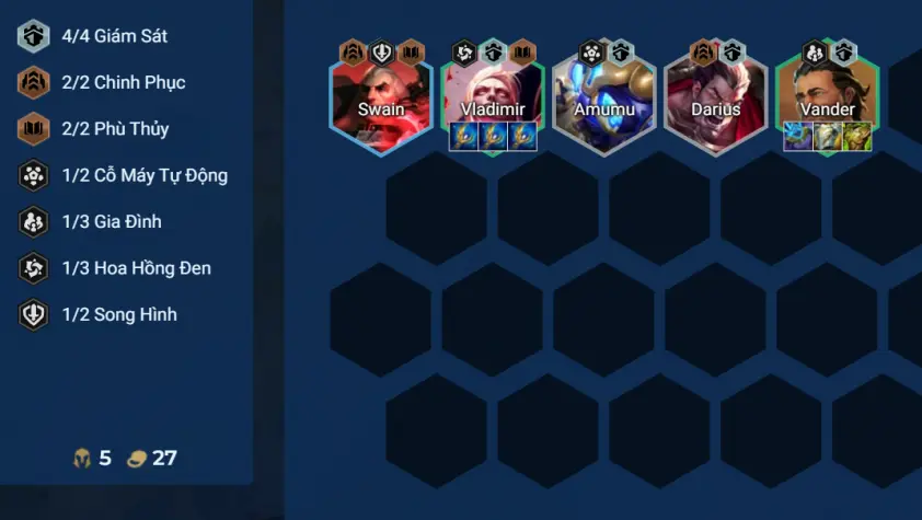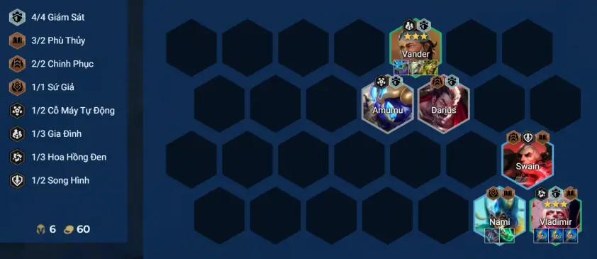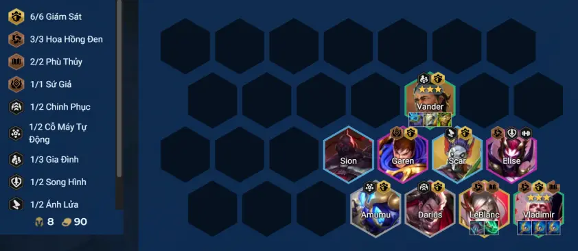 Đội hình Vladimir tập trung xoay quanh Huyết Thệ, trang bị hồi phục và dàn chắn phía trước. Những tướng quan trọng gồm: